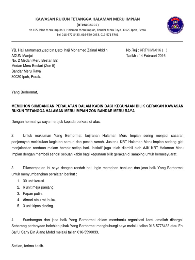 Bantuan khas kewangan 2016. Tujuan surat permohonan bantuan yaitu untuk meminta bantuan dana sehubungan dengan acara yang diselenggarakan. Semoga hari raya tahun ini dapat disambut dengan penuh keceriaan bersama keluarga dan sentiasa mematuhi.